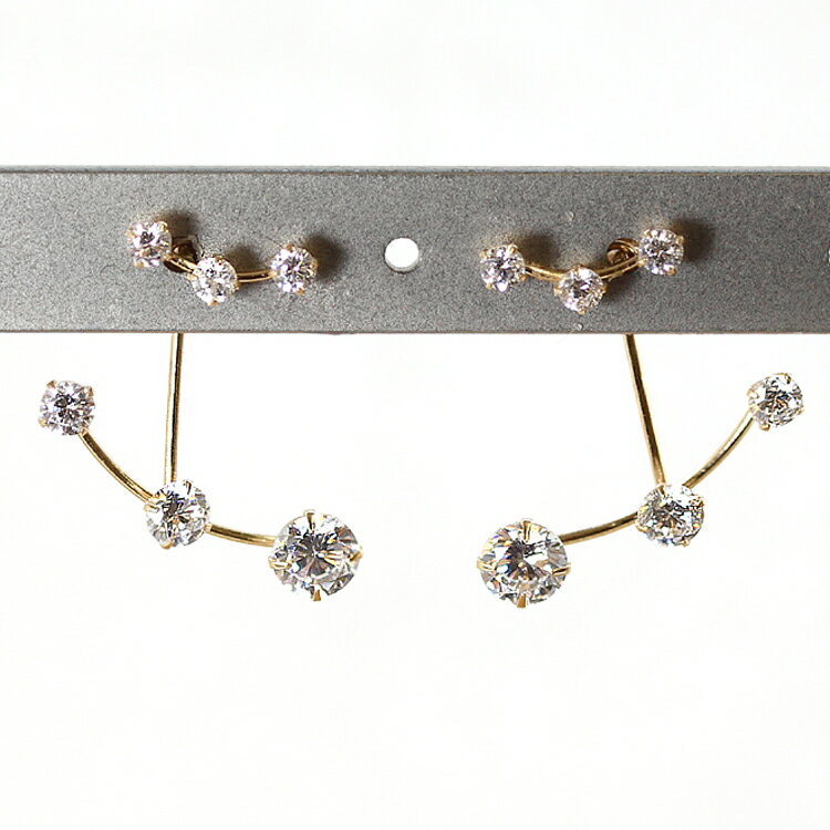 石 キュービックジルコニア 材質 K10ピンクゴールド/K10ホワイトゴールド/K10ゴールド キャッチ K10ピンクゴールド/K10ホワイトゴールド/K10ゴールド ダブルロックキャッチ ポスト 長さ10mm 太さ0.6mm 大きさ 全長:18×17mm ピアス部分:ジュエル 直径2mm チャーム部分:ジュエル(大)直径4mm (中)直径3mm (小)直径2.5mm 品番 P1400681-32つの顔をもつ、夜空できらめくジュエルの星座 キュービックジルコニア×K10カラーゴールドピアス・ベルテラ 「2WAYでたのしめる、上品なきらめき」 夜空できらめく星のような輝きを放つ、キュービックジルコニア。