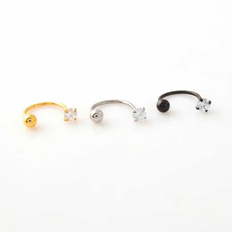 片側に爪でクリスタルのジルコニアをセットしたサーキュラー型のようなカーブした20ゲージのU字型ボディピアス。