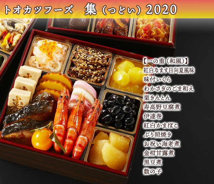 和洋中の豪華な素材を家族皆で味わえるおせち トオカツフーズ和洋中おせち「集」(つどい) トオカツフーズ「集い(つどい)」 冷凍三段重 3〜4人前 14,800円(税込)送料無料 バラエティ豊かな和洋中のおせち 賞味期限:冷凍保存のまま2020年1月31日(金) 配送エリア:全国(沖縄・離島のぞく) 配送日:2019年12月30日(月)(年末配送混雑のため、時間帯指定はできません) 品目数:32品目 3〜4人前